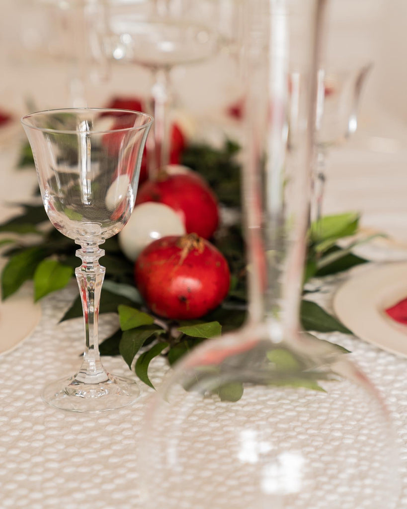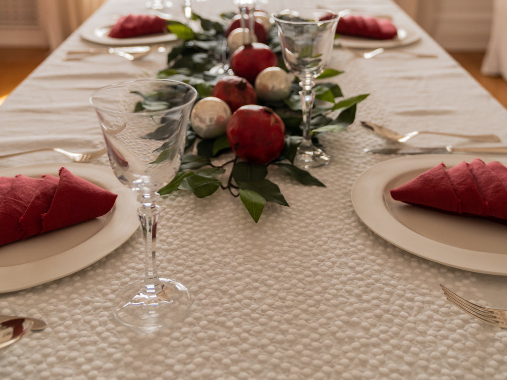 In the spotlight of our festive tableau is the Chicco tablecloth—a true protagonist that sets the tone for elegance and refinement. Even amidst the festive glow, the table remains chic and unconventional, embracing a refined aesthetic that transcends the ordinary. The atmosphere it creates is nothing short of intimate and welcoming, nestled in a delicate, dreamy setting.